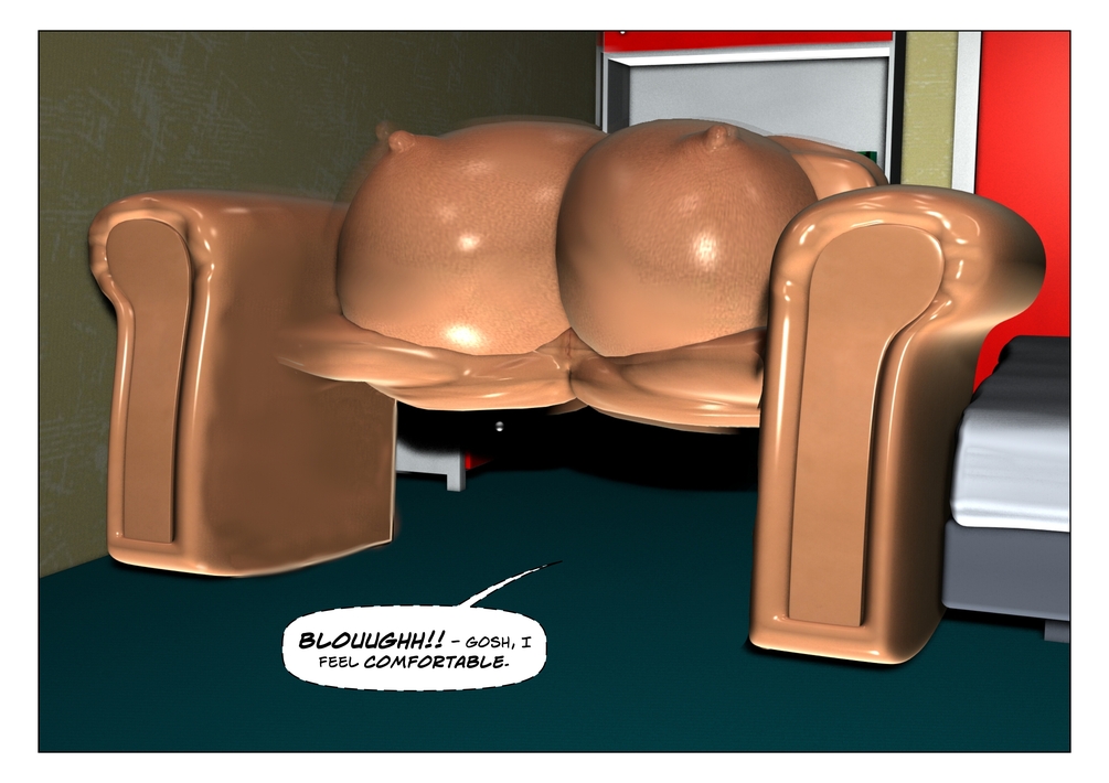 Now alone, Emily tries out extending her finger, turning her hands to pleasuring tentacles before going full-frog/toad. She then splits her body into seperate pieces, before re-emerging and forming the best sofa ever!
